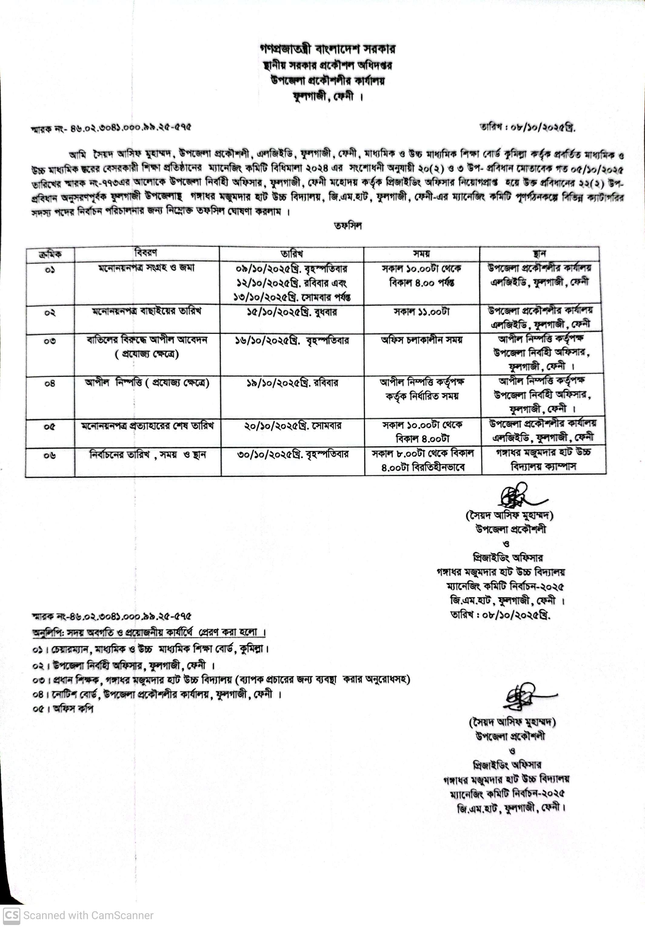 - গঙ্গাধর মজুমদার হাট উচ্চ বিদ্যালয়ের ম্যানেজিং কমিটি নির্বাচনী তফসীল ২০২৫